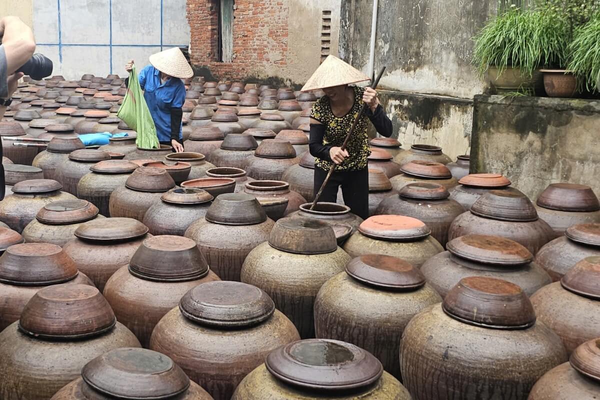 Most households in Ban Yen Nhan Soy Sauce Village own dozens, sometimes hundreds, of traditional clay jars. You’ll see them arranged neatly in open yards, on rooftops, and in large communal spaces.