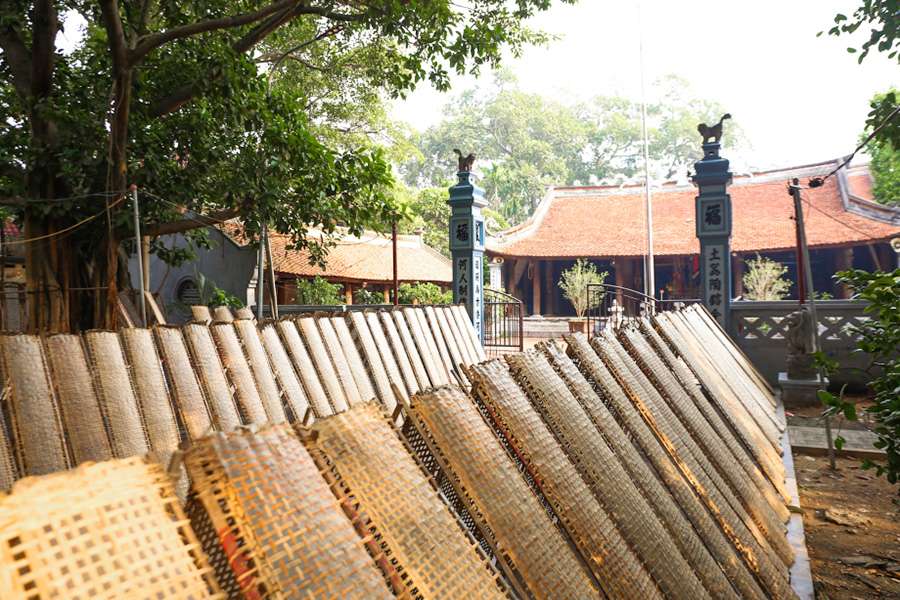 Tho Ha ancient village, with its characteristic of being surrounded by a river like an island, requires crossing by ferry or boat to leave the village. Visiting Tho Ha ancient village, you will have the chance to admire every corner of the village, alleys, walls, ponds, and wherever there is sunlight, there are rice paper cakes. Walking around the ancient village of Tho Ha, you will experience the peaceful and picturesque rural scenery of Tho Ha. When reaching the end of the village, you will encounter the familiar sight of hands skillfully baking rice paper cakes over charcoal stoves. The large rice paper cakes, hot, golden, and crispy, emit a delicious aroma.