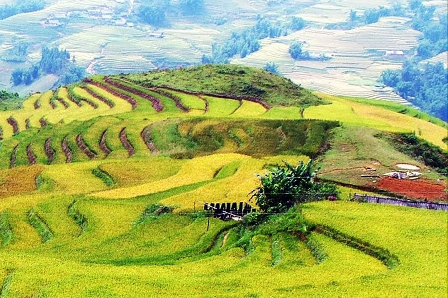 From a high vantage point, you can get a panoramic view of the entire village. What you see in front of you is a landscape resembling an oil painting with a full range of colors, highlighted by the terraced rice fields, winding and vibrant, along with simple thatched-roof houses. Depending on the time of year, these terraced fields will change colors. Sometimes they are a lush green of young rice leaves, and other times they glow brilliantly when the rice is ripe.